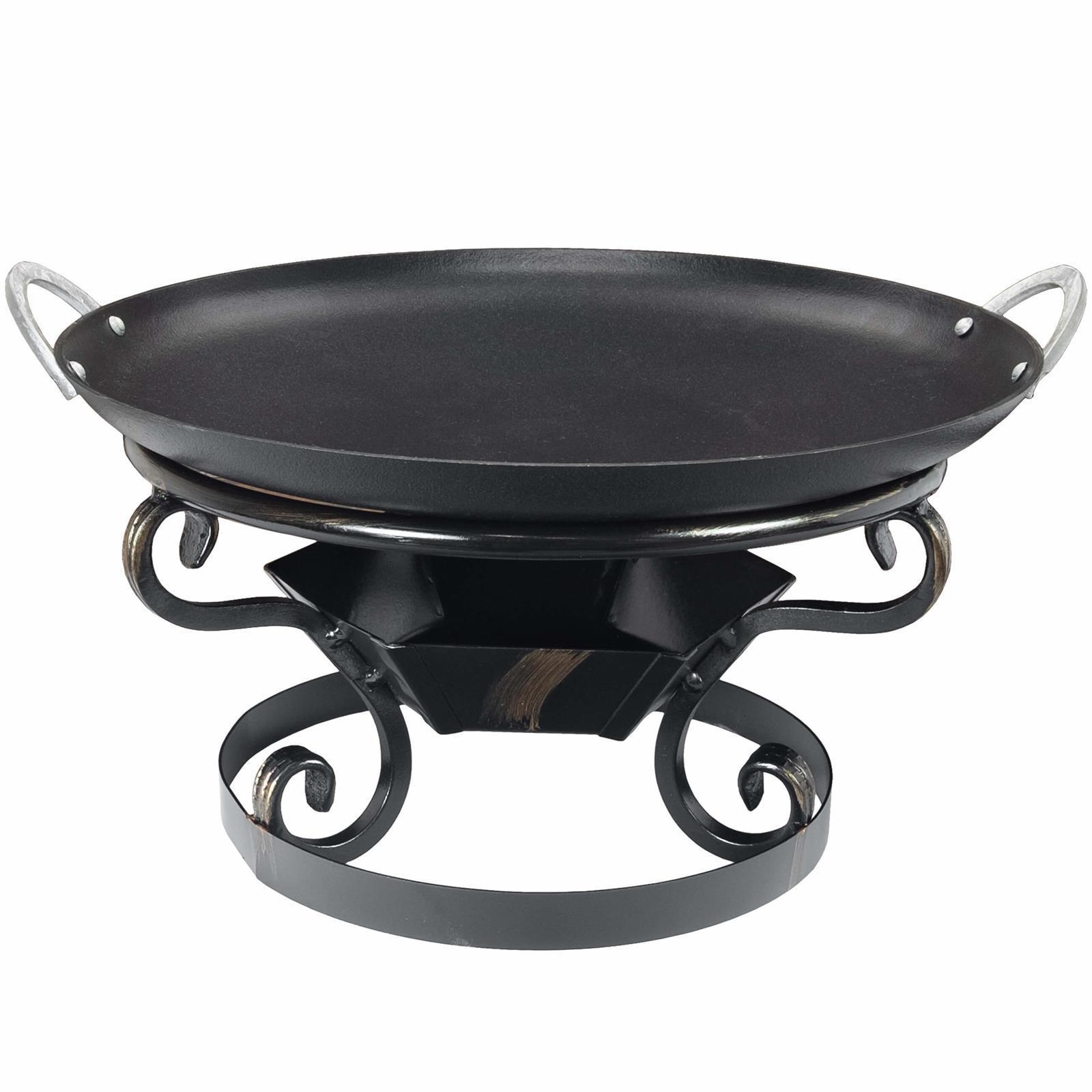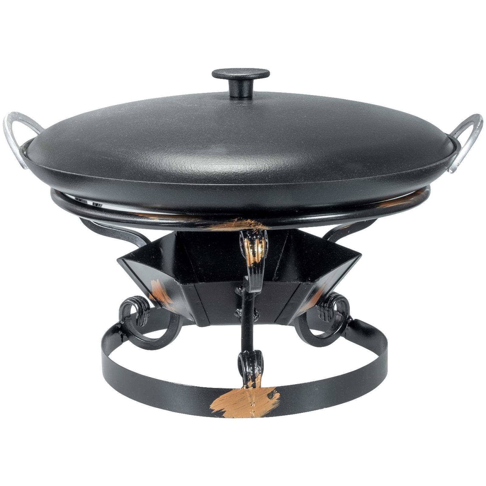 Zusätzlich erhalten Sie ein Gestell mit integrierten Warmhaltefunktion. Damit können Sie Ihre Gerichte direkt Servieren und warmhalten. Als Brennmaterial eignet sich z.B. Brennpaste, Teelichter oder sogar Holz- und Kohle-Briketts.