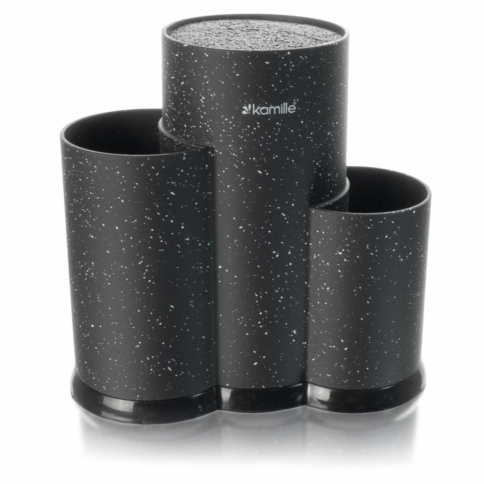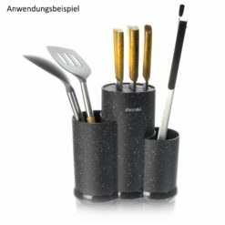 Dieser elegante Küchenhelfer aus robustem Kunststoff bringt Ordnung in Ihre Küche. Der eine Bereich bietet Platz für verschiedene Küchenhelfer mit langen Griffen, der andere Bereich ist mit zahlreichen Schlitzen zur Unterbringung von scharfen Messern ausgestattet.