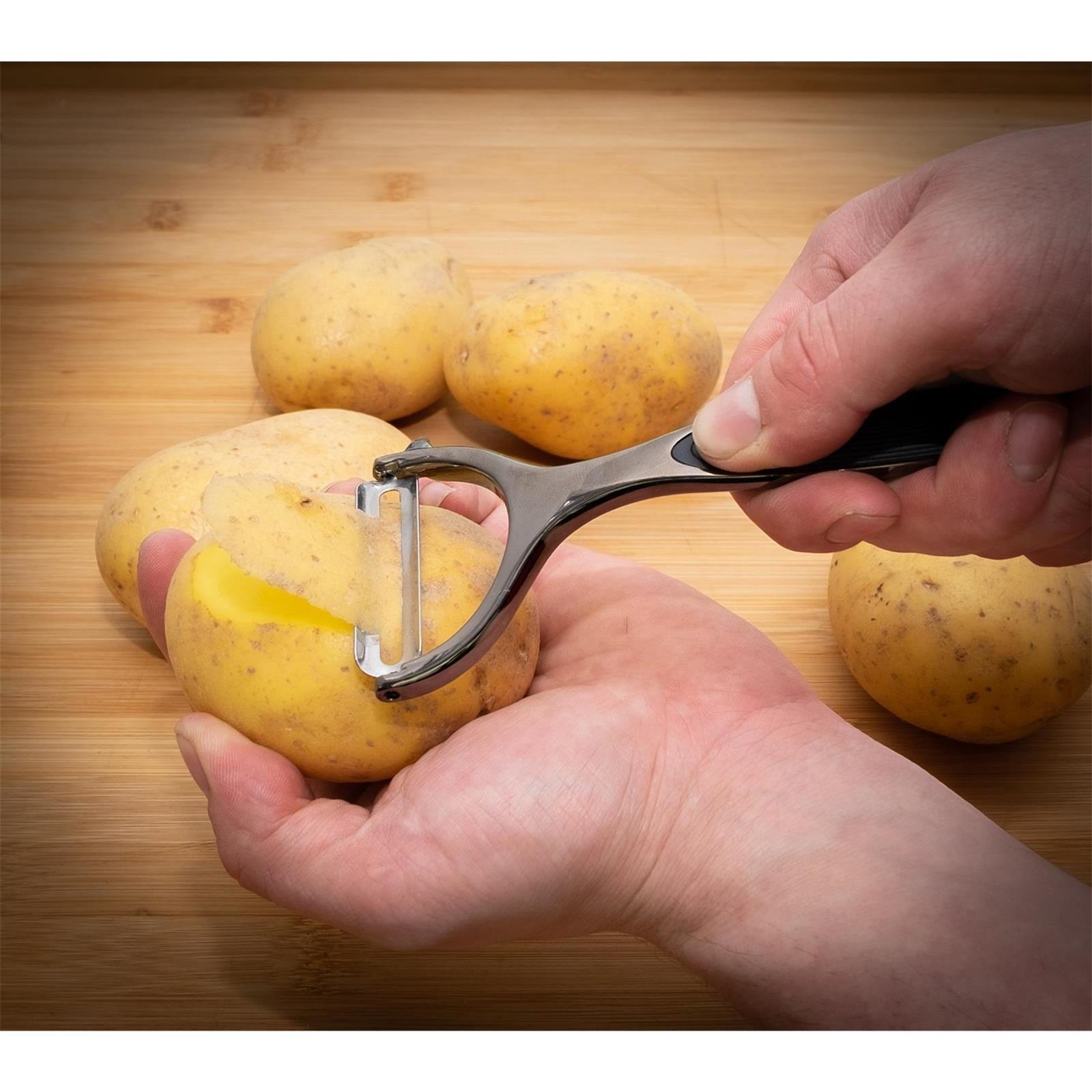 Ein praktischer Helfer bietet die perfekte Ergänzung Ihrer Kochuntensilien. Mit einem Schäler gelingt selbst die mühsame Küchenarbeit leicht und schnell. Der Sparschäler trennt von Äpfeln, Gurken, Kartoffeln oder auch Spargeln extradünne Schichten ab und spart Ihnen die Zeit. Die Klingen des Küchenhelfers sind aus rostfreiem und langlebigem Zinklegierung gefertigt.